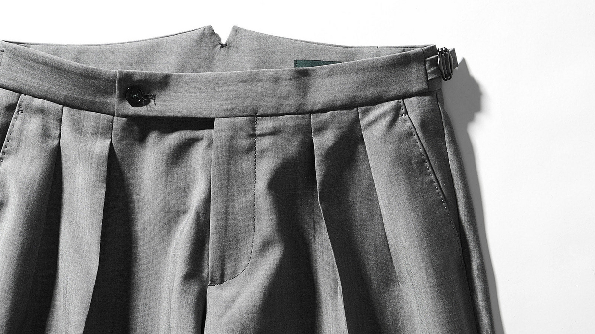 ディテールはサイドアジャスターにツーインプリーツというザ・クラシックなシルエットです。